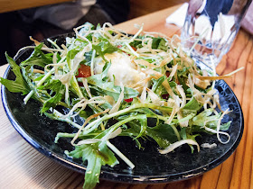 The food started showing up pretty shortly thereafter. This is the Mizuna Salad. Burrata, tomatoes and dashi gelee. Pretty and light.